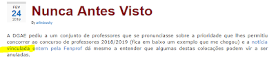 A DGAE pediu a um conjunto de professores que se pronunciasse sobre a prioridade que lhes permitiu concorrer ao concurso de professores 2018/2019 (fica em baixo um exemplo que me chegou) e a notícia vinculada ontem pela Fenprof dá mesmo a entender que algumas destas colocações podem vir a ser anuladas.